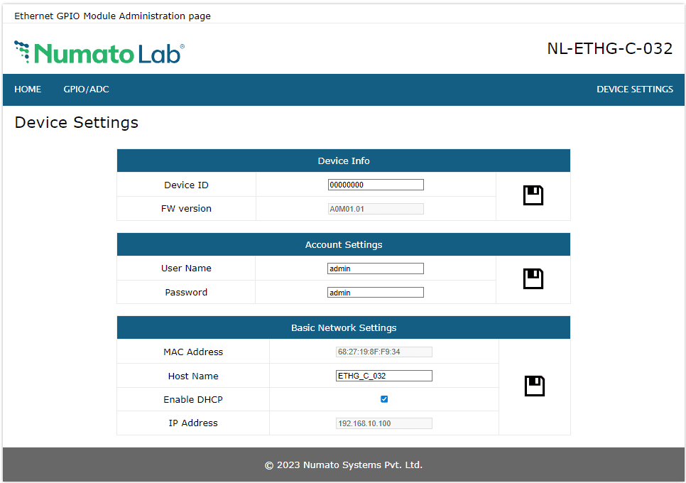 | 7 | info | None | info | Displays Device information like Name, IP address, MAC ID, GPIO status etc... |
