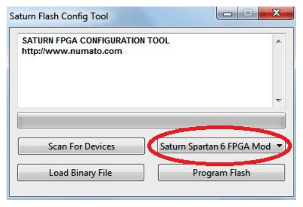 Step 1: Open Saturn Config Tool. Click “Scan for Devices” if the “Saturn Spartan 6 FPGA Module” is not detected automatically.