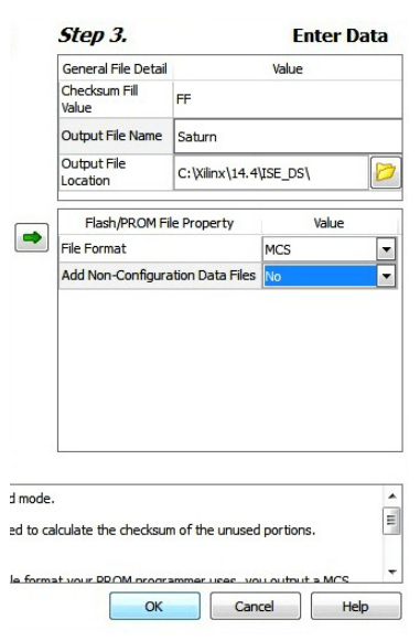 Step 3: Set an output file name and the output file location (the “.mcs” file will be generated at this location which will be required later for programming the FPGA), then click OK twice, then select the “.bit” file we already generated then click Open and click NO when it prompts to add another device file.