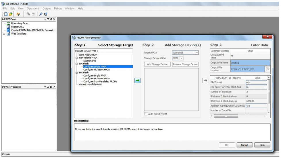 Step 1: Open ISE iMPACT. Click on “Create PROM file(PROM file formatter)”. In the dialog box, select “Configure Single FPGA” in the storage device type. Then click on the green arrow on the right side.