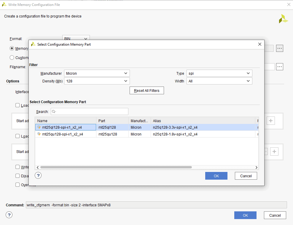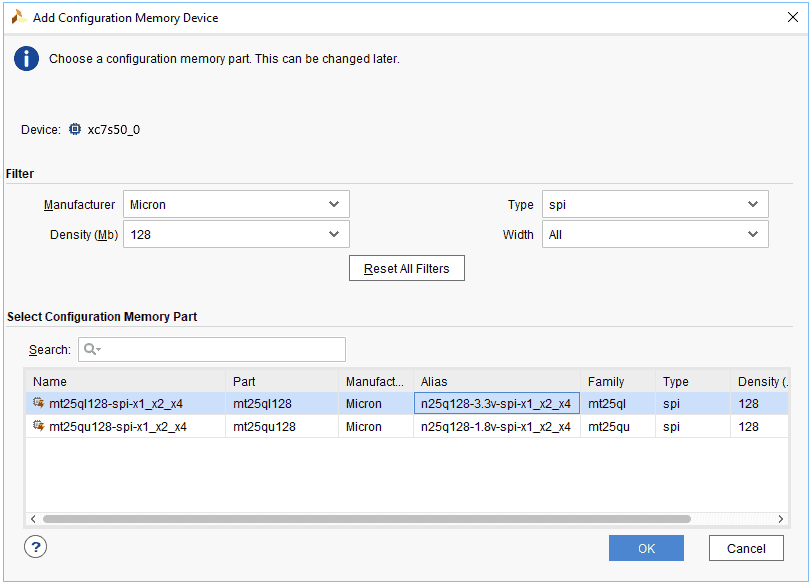 Step 3: Select the memory device “mt25ql128-spi-x1_x2_x4 (which is equivalent to n25q128-3.3v-spi-x1_x2_x4)”, then click OK.