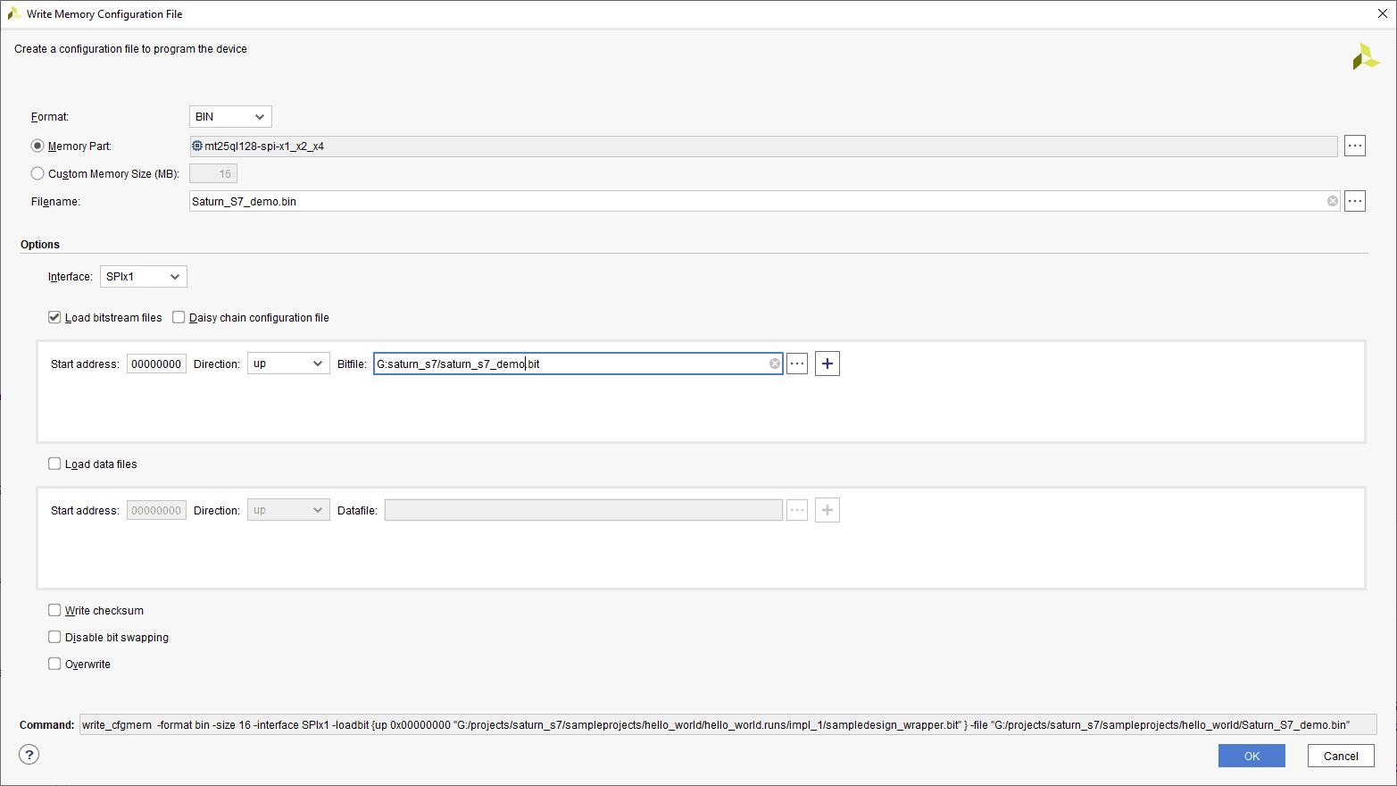 Step 3: Browse to the path where you wish to save the Configuration File and type the file name as “Saturn_S7_demo.bin” (or any name as per your wish/requirement) to save the memory configuration file (the format of the file may change depending on your “Format”). Select the “Load bitstream files” under the “Options” tab and browse to the “.bit” file we already generated then click “OK” to generate the memory configuration file.