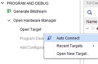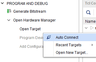 Step 1: Open the Vivado project and open the target by clicking on the “Open Target” in “Open Hardware Manager” in the “Program and Debug” section of the Flow Navigator window. Select “Auto Connect”.