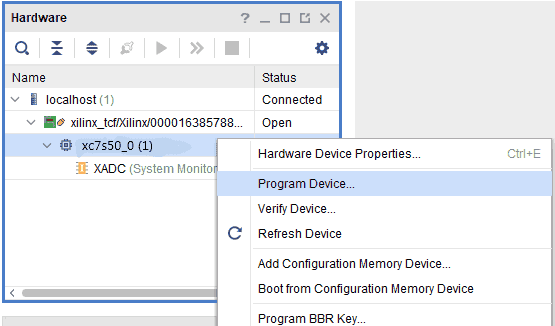 Step 3: If the device is detected successfully, then select “Program Device” after right-clicking on the target device “xc7s50_0 (1)” as shown below.