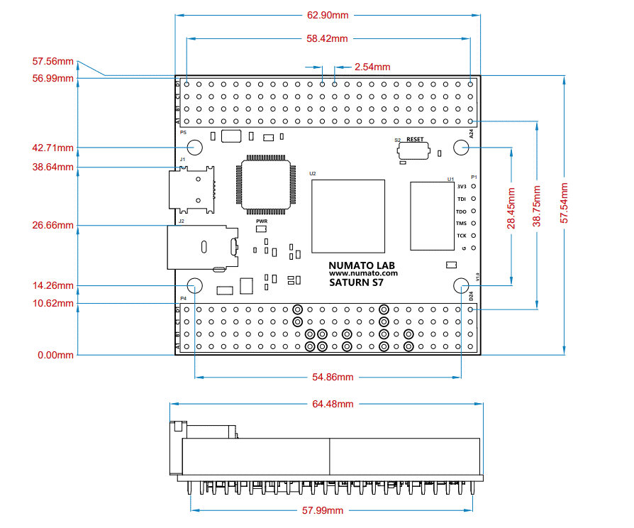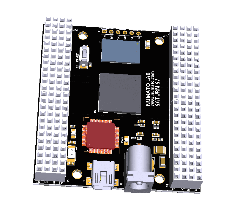 Saturn S7 is an upgraded version of Saturn S6 FPGA development board. It is an easy to use FPGA Development board featuring Spartan 7 FPGA. It was created specifically for the development and integration of FPGA-based features into other designs. It is pin compatible with many other FPGA development boards such as Narvi S7, Spartan S6 etc… Saturn S7 is a great platform for implementing Soft processors such as Microblaze to make it a complete embedded platform. The USB 2.0 host interface based on popular FT2232H offers high bandwidth data transfer and board programming without the need for any external programming adapters. Saturn S7 provides the user with the flexibility of adding their own peripherals through IO Expansion Headers. Additional external reset pin, help the designers to synchronize the signal.