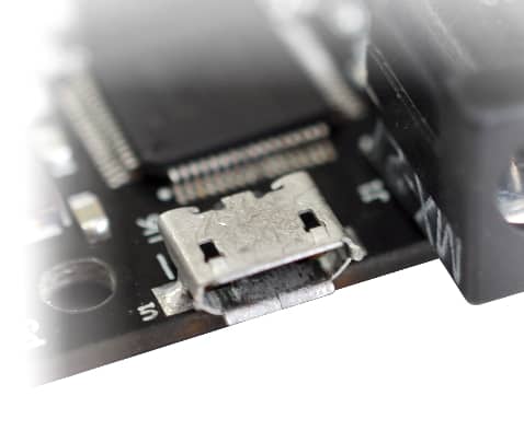 The on board full speed USB controller helps a PC/Linux/Mac computer to communicate with this module. Use a USB A to Micro B cable to connect with a PC. By default the module is powered from USB so make sure not to overcrowd unpowered USB hubs (the picture on the right shows USB Micro connector).