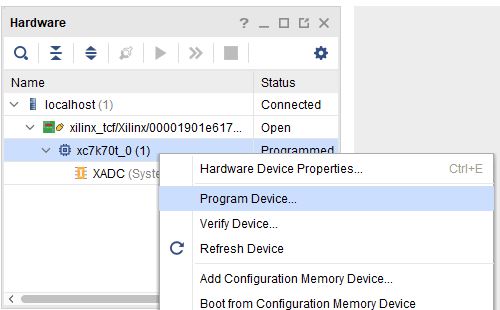 Step 3: If the device is detected successfully, then select “Program Device” after right clicking on the target device “xc7k70t_0 (1)” as shown below.