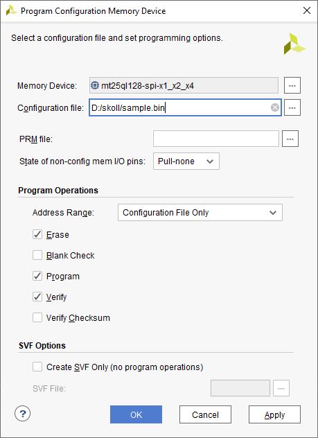 A .bin or .mcs file is required for programming Skoll Kintex 7’s onboard QSPI flash.
