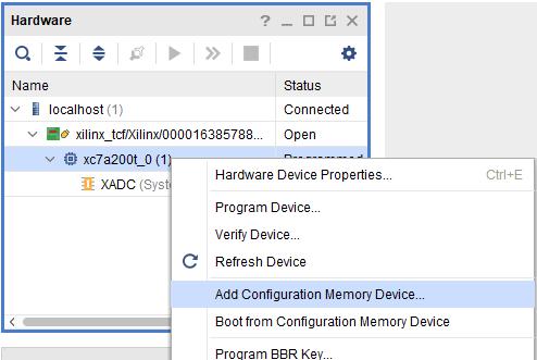 Step 2: If the device is detected successfully, then select “Add Configuration Memory Device” by right click on the target device “xc7a200t_0” as shown below.