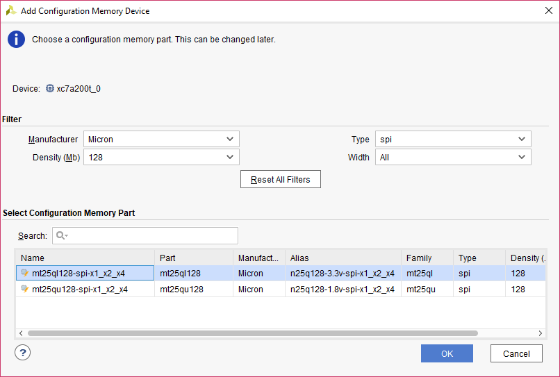 Step 3: Select the memory device “mt25ql128-spi-x1_x2_x4 (which is equivalent to n25q128-3.3v-spi-x1_x2_x4)”, then click OK.
