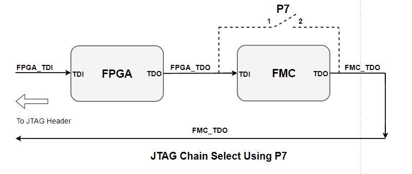 Tagus has automatic FMC detection using the PRSNT_M2C_L signal from FMC. Normally, when an FMC board is not connected, the Tagus’s onboard circuitry will automatically close the JTAG chain keeping FMC out from the chain, so no user intervention is required. But, still, jumper P7 has been provided as a redundant back up to close the JTAG chain in case the automatic circuitry doesn’t work due to non-compliant FMC modules connected to the Tagus, or any or unforeseen reasons.