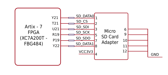 The Tagus board features an onboard Micro SD adapter. You can add the data logging, media storage, and other file storage by installing Micro SD Card and appropriate IP. The connection between FPGA and Micro SD Card is shown below