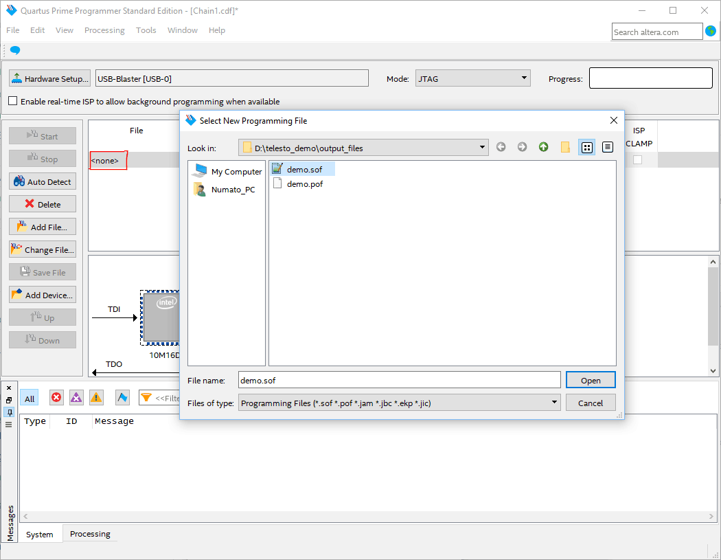 Step 3: Double-click “none” as shown below and select the “.sof/.pof” file to program Telesto with.