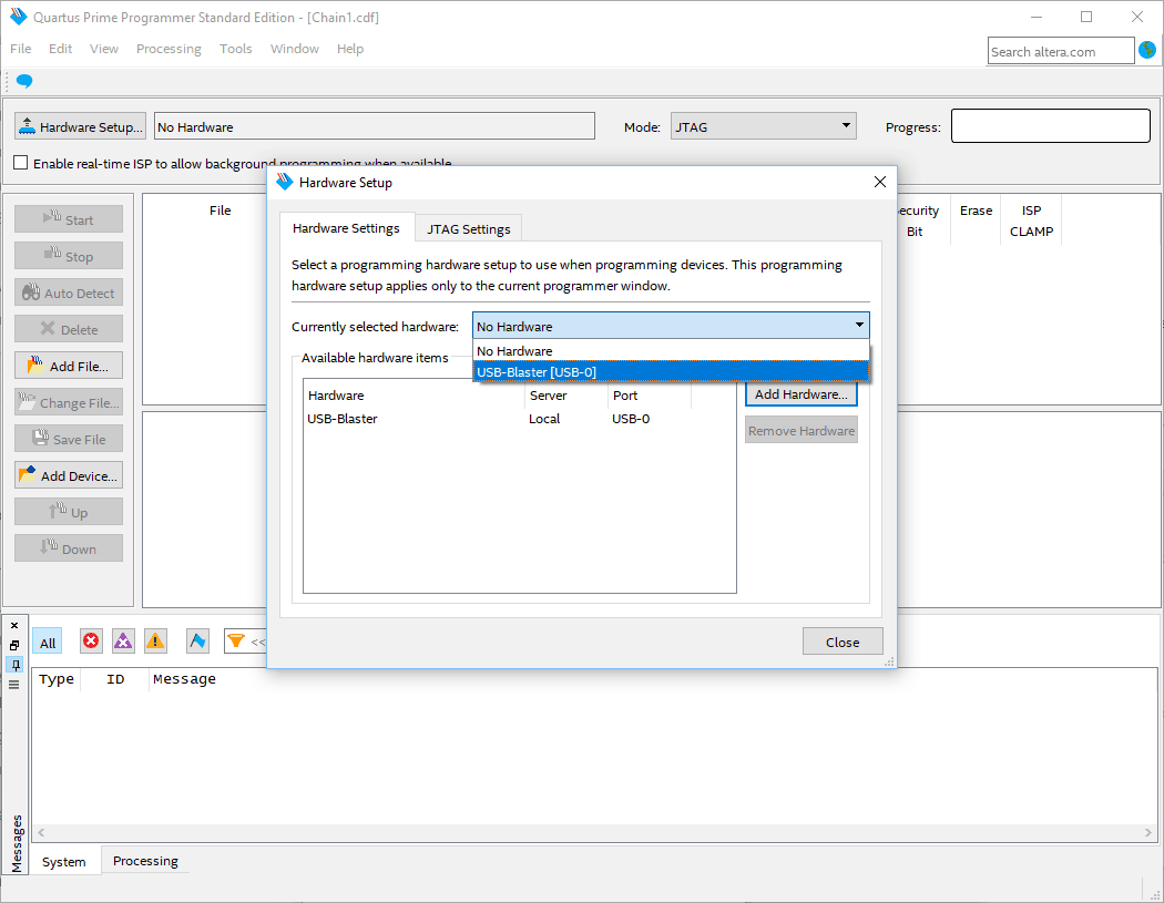 Step 1: Run Quartus Prime Programmer and set up the hardware by clicking “Hardware Setup” as shown below. Select the hardware as “USB-Blaster” or equivalent.