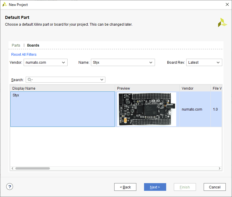 In the Default Part window, select “Styx” from the Boards option. If Styx is not listed, make sure board support files are installed correctly. Click Next to continue.