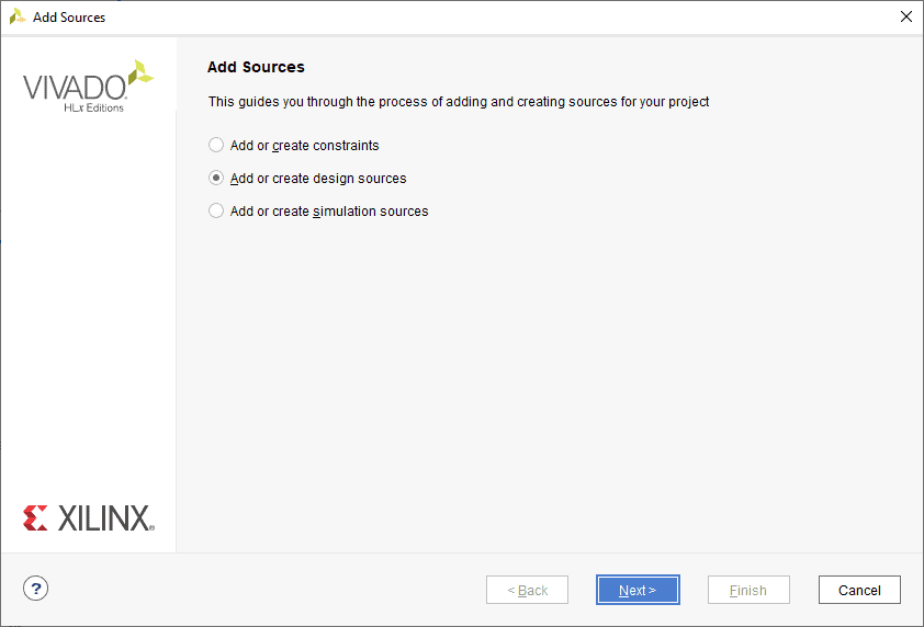 Select Add Sources under the Flow Navigator ->PROJECT MANAGER section. Now select “Add or create design sources” and click Next.