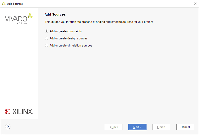 To create the constraints file, go to Add Sources under the Flow Navigator –> PROJECT MANAGER window, select the “Add or create constraints” and click Next.
