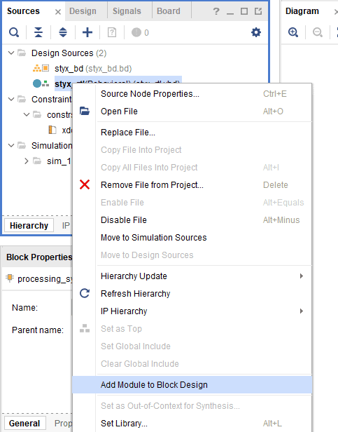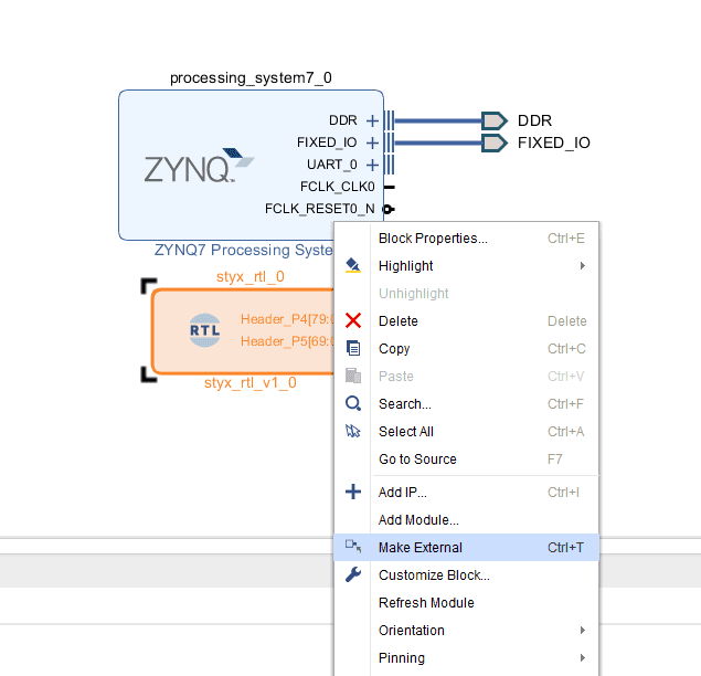 Go to Sources Tab, right-click on your Verilog or VHDL top module and select “Add Module to Block Design” which will add the RTL module to the block design.