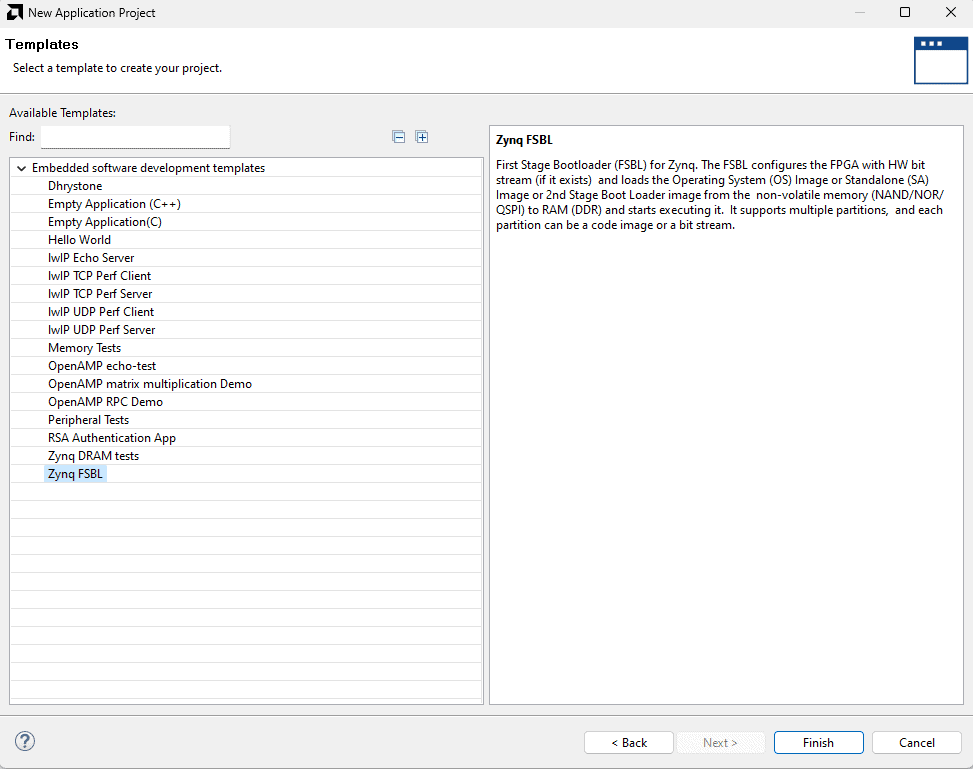 Now select the Zynq FSBL template from the list of available templates and click Finish.