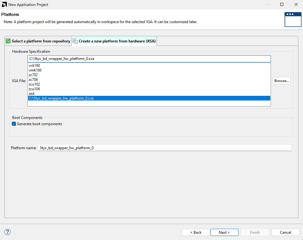 In the “Platform” window, select “Create a new platform from hardware” tab and import the “XSA file” which is already created (Provide XSA file location). click “Next”