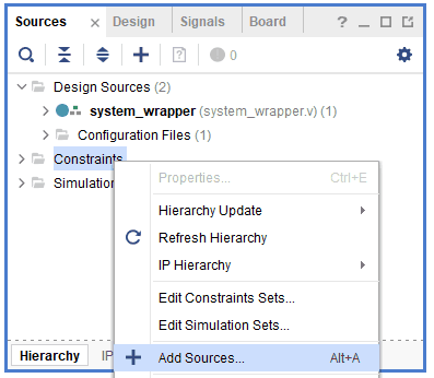 We have to add constraints for some ports in the design. Since we have BSP, most of the ports would be assigned from the BSP. We will have to manually assign for the rest of the ports. Right-click on “Constraints” in the Sources window, and select “Add Sources” as shown below.