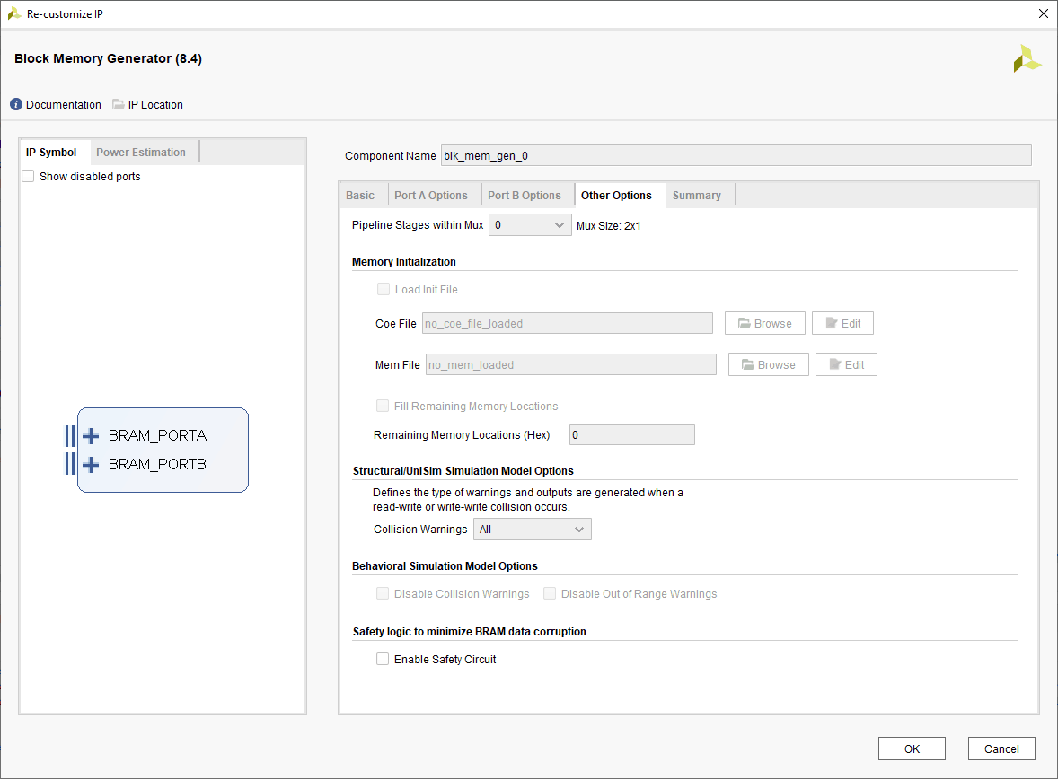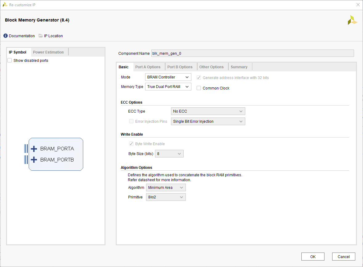 Double-click on “Block Memory Generator” to customize it. In the Basic tab, select the Memory Type as True Dual Port RAM.