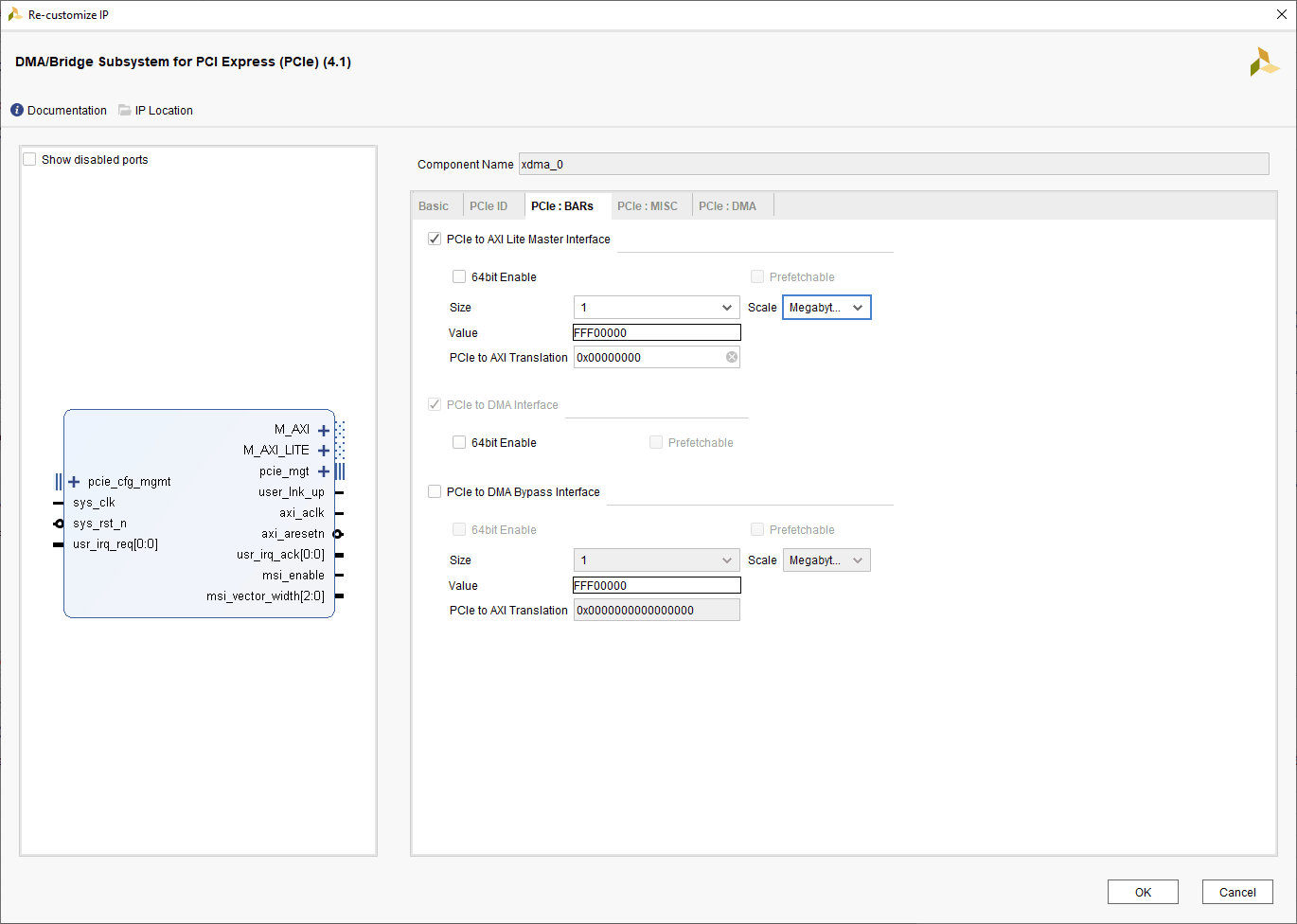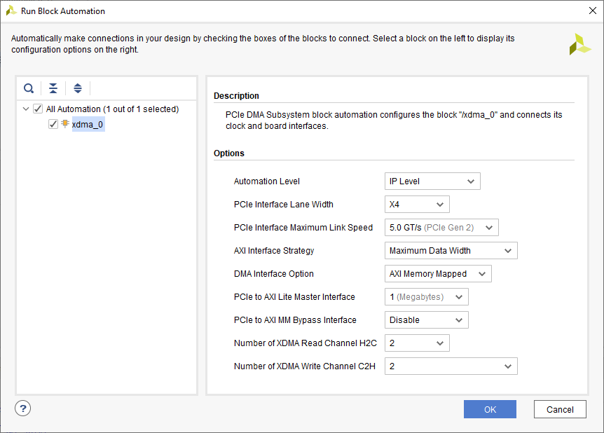 Click “Run Block Automation” and select the “All Automation” checkbox in the window that follows. Under the “Options” tab, select 1 Megabytes for the “PCIe to AXI Lite Master Interface” option. Make sure that the settings are as shown below.