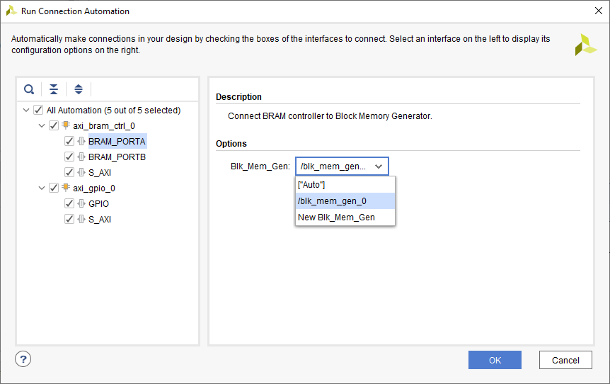 Click “Run Connection Automation”. In the Run Connection Automation window, select the “BRAM_PORTA” interface and change Blk_Mem_Gen under “Options” to /blk_mem_gen_0 as shown in the image below. Repeat the same for “BRAM_PORTB” and click “OK”.