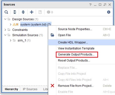 Right-click on the block design file in the “Sources” window, select “Create HDL Wrapper” and click “OK” in the dialog box that follows, to let Vivado generate a wrapper for you. Then select “Generate Output Products”.