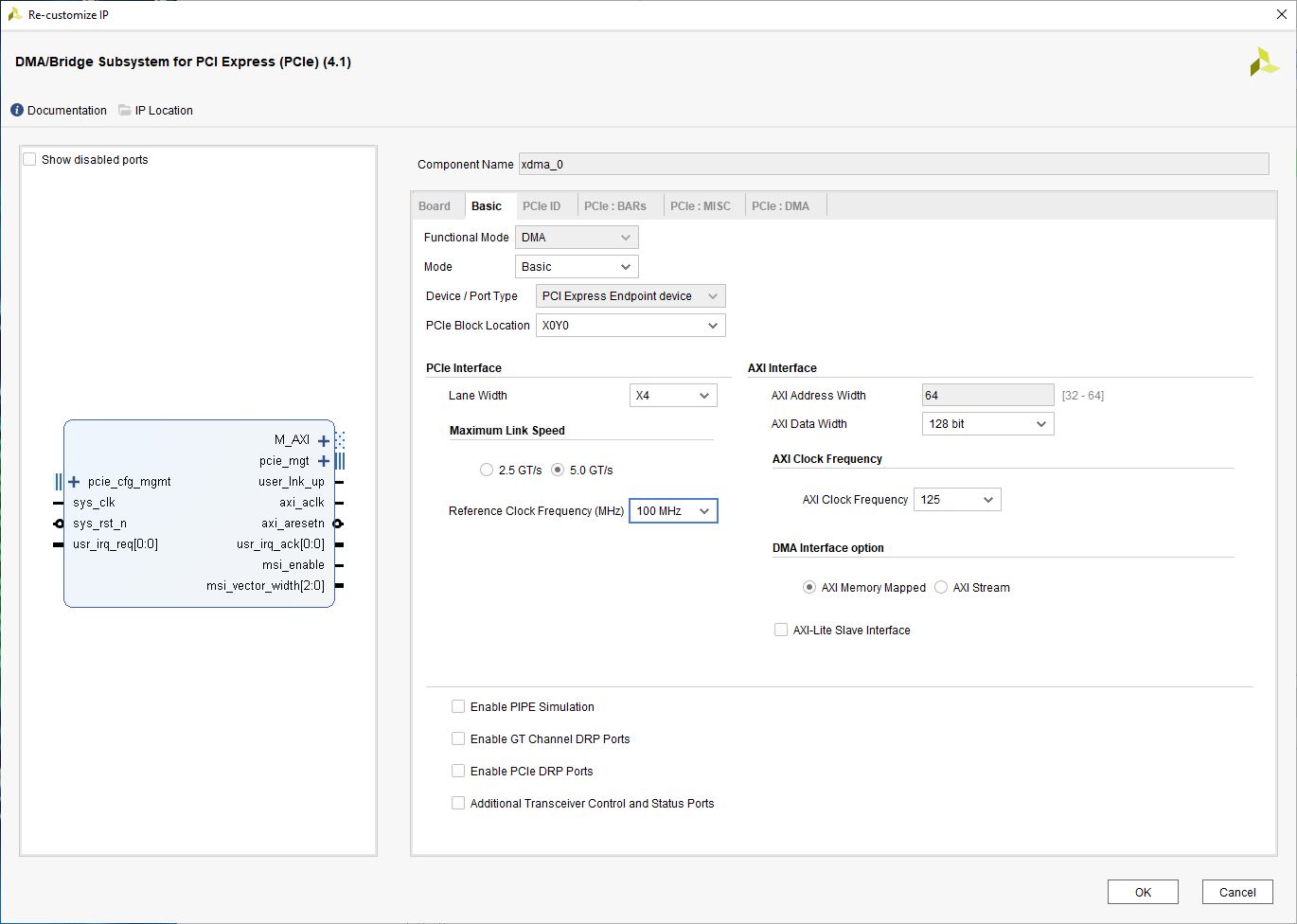 We have to configure the XDMA IP for our example design for Aller. Double-click on the IP to customize it as follows.