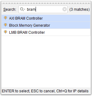 Again, click “Add IP” in the “Diagram” window and search for “AXI BRAM Controller” and “Block Memory Generator” as shown below. Drag and drop the IPs to the design.