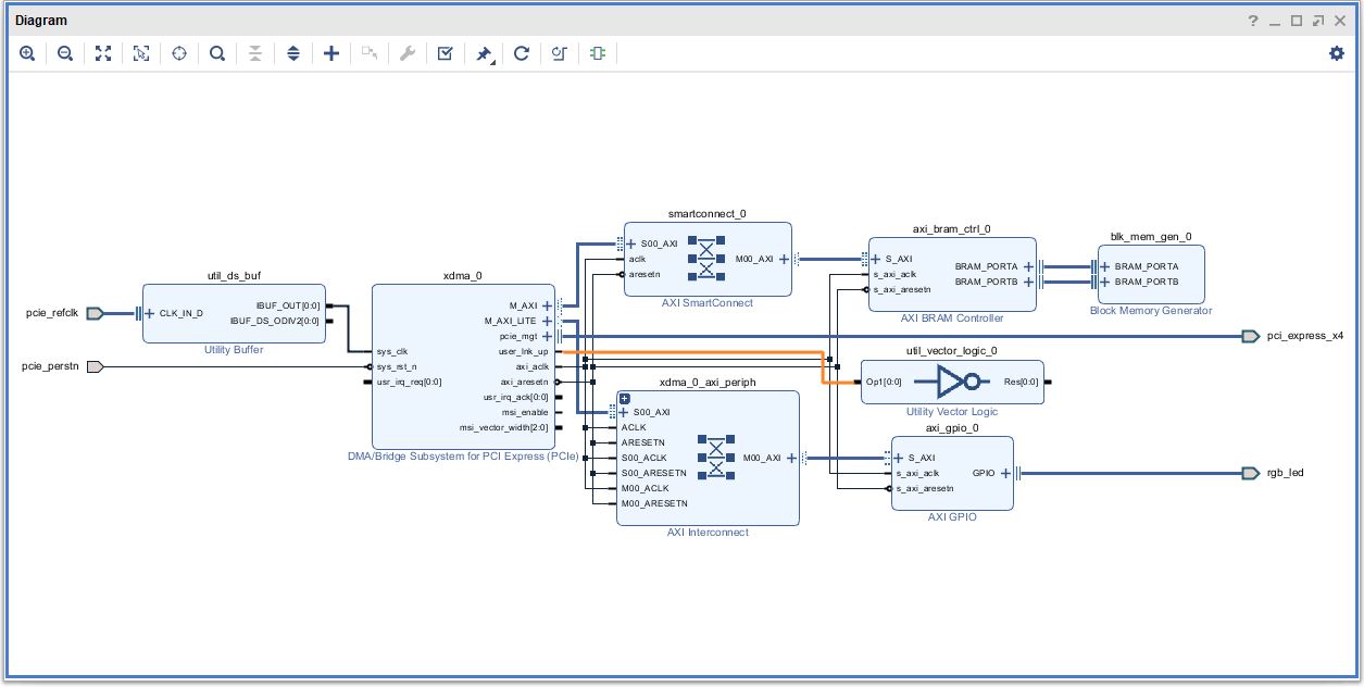 The XDMA IP core has a user_lnk_up output port which indicates that the PCIe core is linked up with a host device. Connect this pin to the input of “Utility Vector Logic” as shown below.