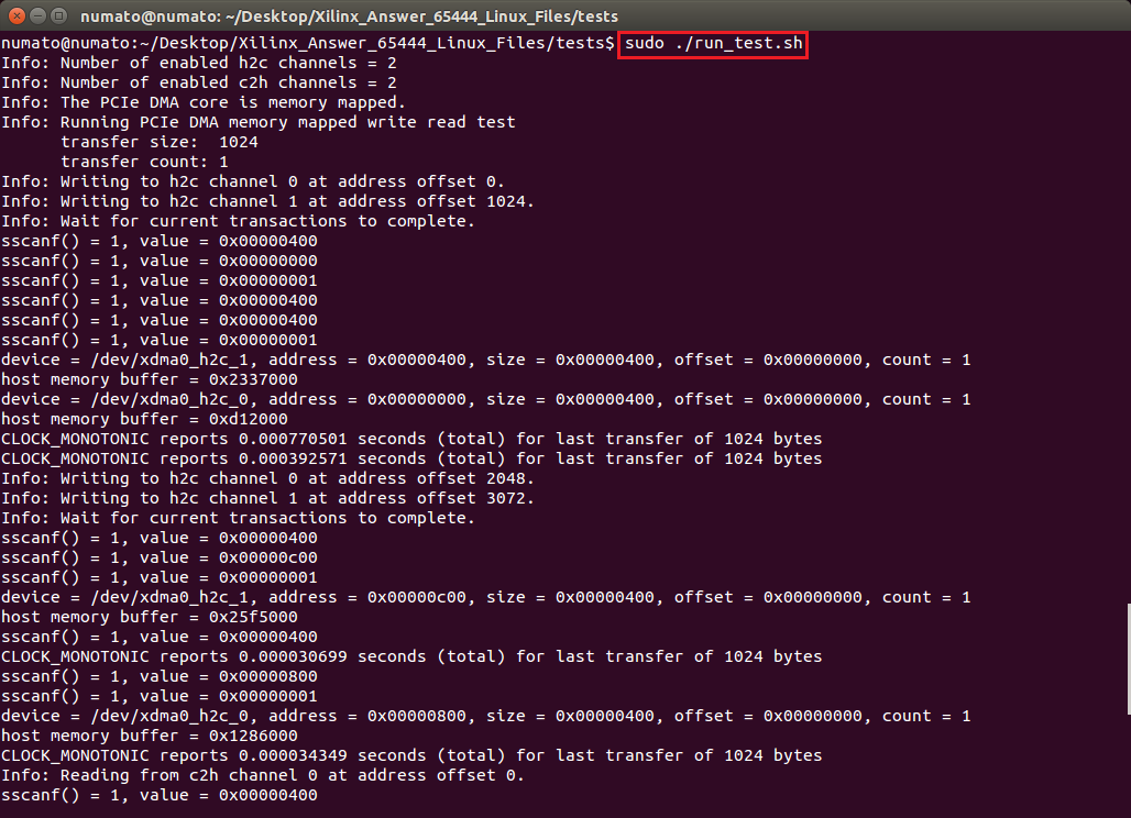 We can now test the DMA. This can be done by running the script “run_test.sh” using the following command: