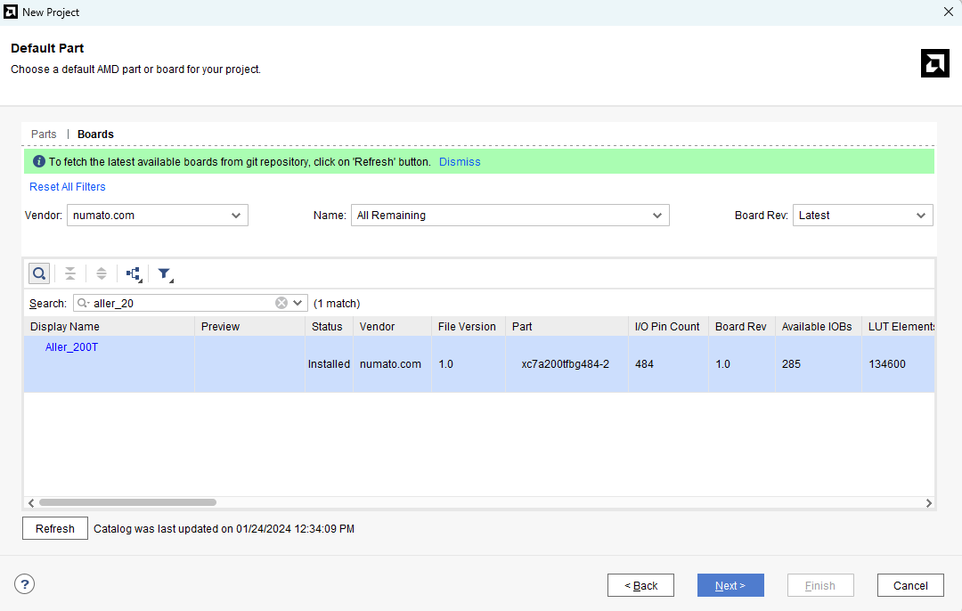 On the “Default Part” page, select the “Boards” tab. Choose the Vendor as “numato.com” and select “Aller_200T” from the list of boards as shown below. If “Aller_200T” is not listed, make sure that the board support files are installed correctly. Click “Next” to continue.