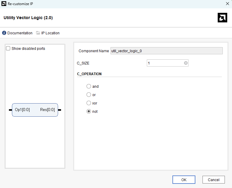 Double-click on the IP to customize it as shown in the image below. Change C_SIZE to 1 and C_OPERATION to “not”. Click “OK” to customize the IP.