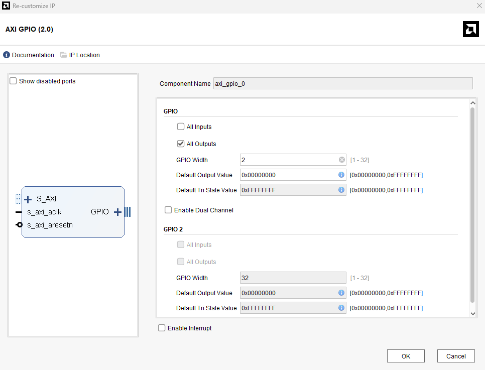 Double-click on the IP and customize it to give a 2-bit output as shown below. In the IP Configuration tab, enable “All Outputs” and change the GPIO Width to 2. We will connect this GPIO port to the red and blue LEDs in Aller.