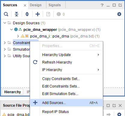 We have to add constraints for some ports in the design. Since we have BSP, most of the ports would be assigned from the BSP. We will have to manually assign for the rest of the ports. Right-click on “Constraints” in the Sources window, and select “Add Sources” as shown below.