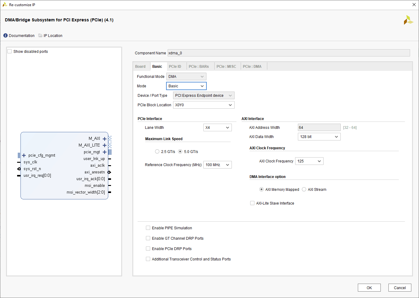 To customize the IP, double-click on the IP. The “Re-customize IP” window should open. In the Basic tab, Select “Lane Width” as “X4”, “Maximum Link Speed” as “5.0 GT/s”. In the “BARs” Tab, enable “PCIe to AXI Lite Master Interface” and set the Size Value as “1 Megabyte”. In the “Misc” tab, disable the “Configuration Management Interface” option and in the “DMA” tab, change the “Number of DMA Read Channel (H2C)” & “Number of DMA Write Channel (C2H)” to 2. Leave the other tabs in their default state and click OK. Refer to the images below for the settings mentioned in this step.