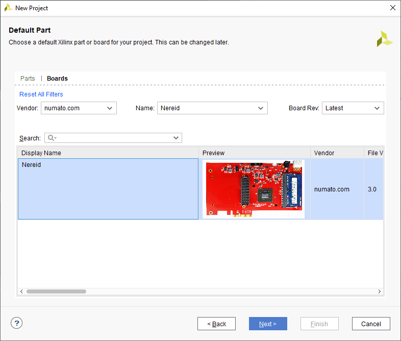 Select “Boards” from the “Default Part” tab, choose “numato.com” as Vendor. Select “Nereid” and click “Next”. If Nereid is not listed, make sure board support files are installed correctly. Click “Finish”. A new Vivado project will open with the selected settings.