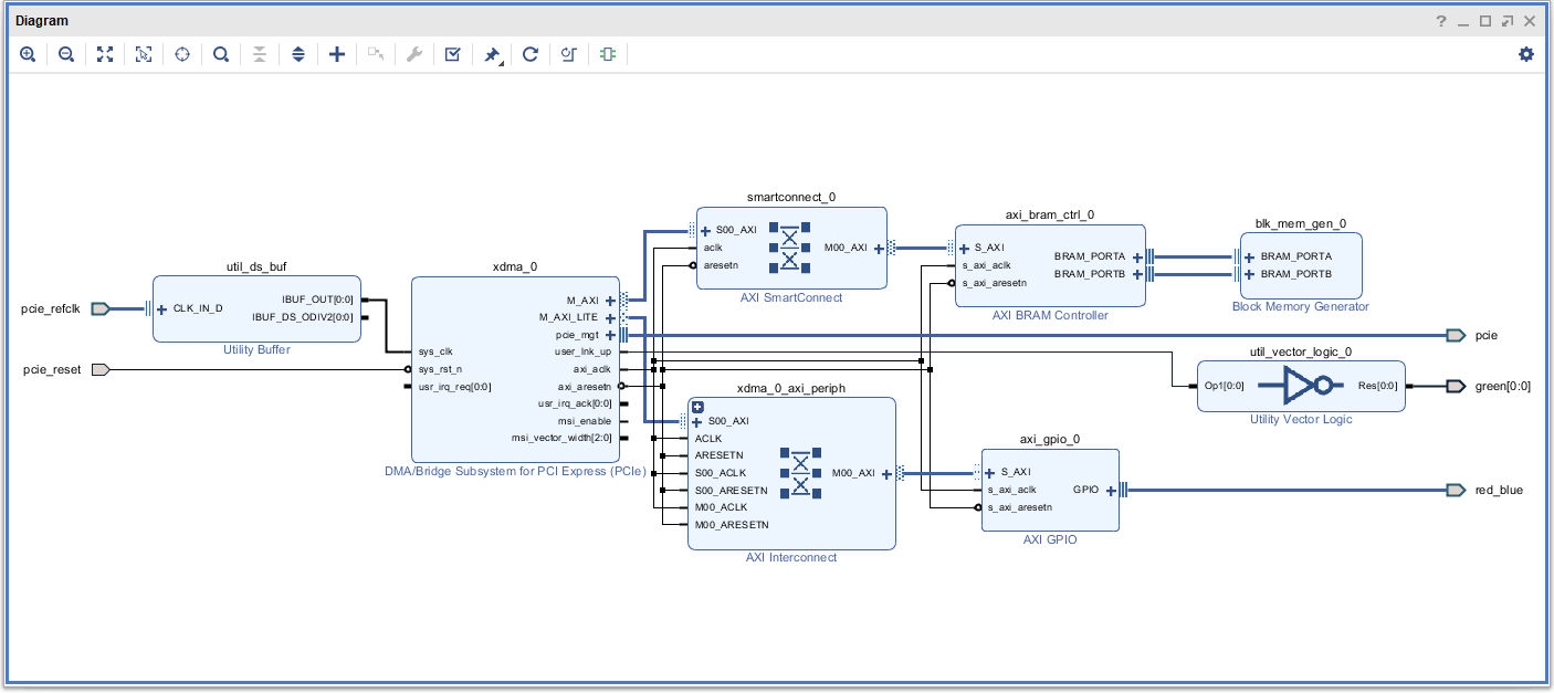Connect the input of Utility Vector Logic to “user_lnk_up” of “xdma_0” IP as shown in the image below (the highlighted connection in the below image).