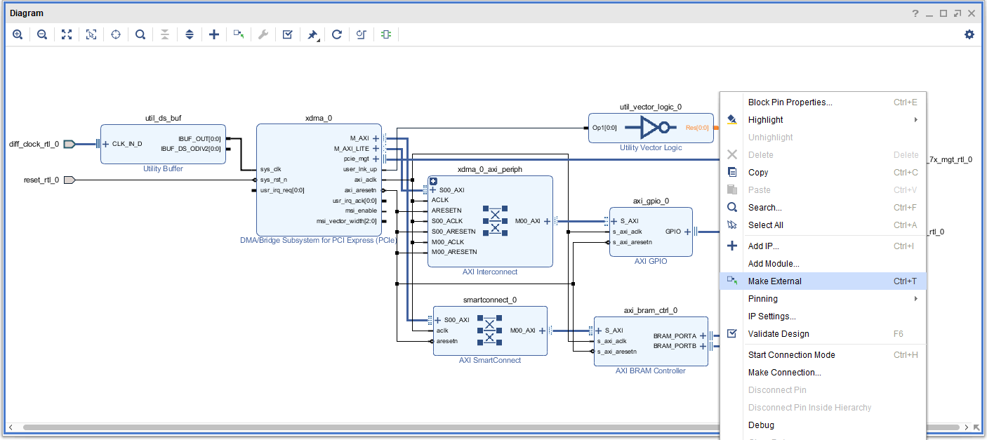 Now, right-click on the “Res[0:0]” pin of the Utility Vector Logic IP and select the “Make External” option to make the pin an output signal. This output port is connected to the Green LED of the board.