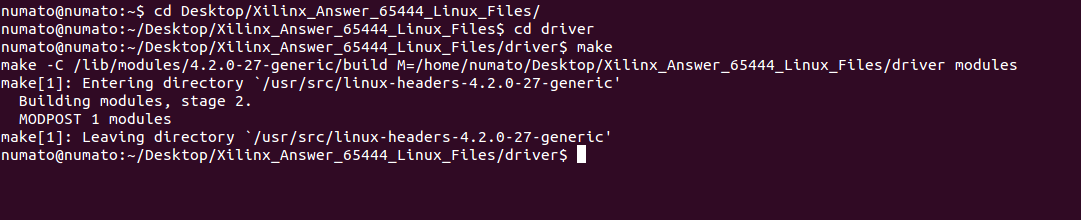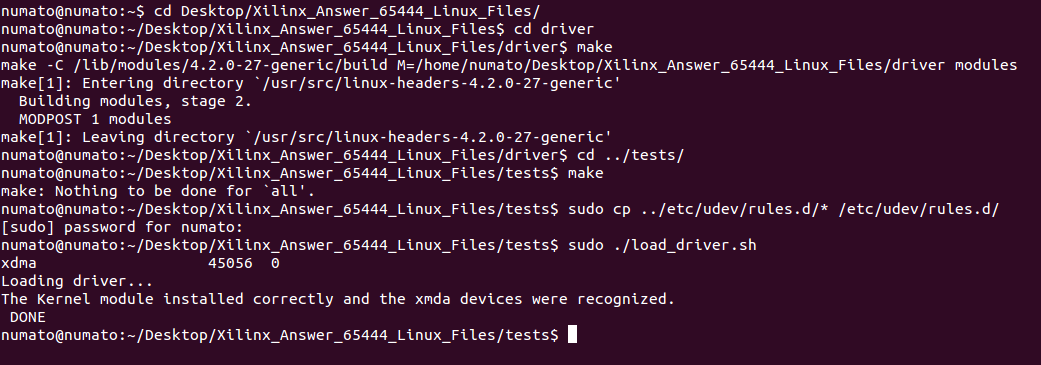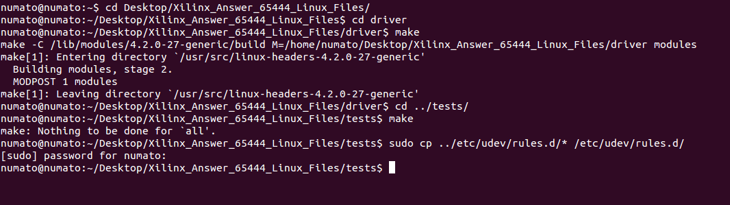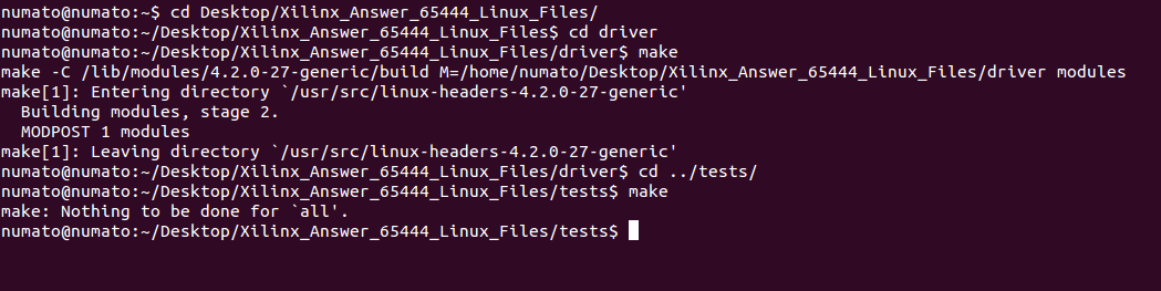 In the command-line terminal, open the path where you saved the ‘Xilinx_Answer_65444_Linux_Files’ folder. Enter the “driver” folder by using the command cd driver/ and compile the C program by using the command “make”. Once it is compiled successfully, use the following command cd ../tests/ to go to the “tests” folder and compile the C program by using the command “make”.