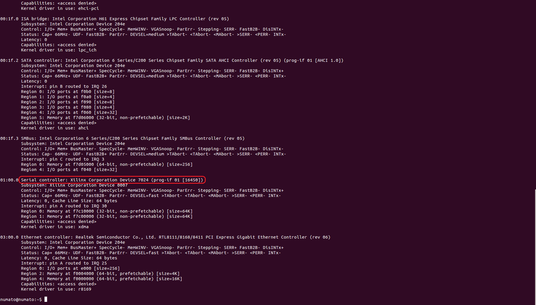 lspci -vv the output of the command is shown below. Make sure the Nereid Board is inserted correctly into the PCIe Slot of the host system’s motherboard. If the host is unable to detect Nereid (which should show up as “Serial controller: Xilinx Corporation Device 7024” as in the image below), make sure the board is inserted correctly into PCIe Slot and do a soft reset after the host is powered up. A soft-reset after the host is powered up helps the host detect FPGA-based PCIe devices.