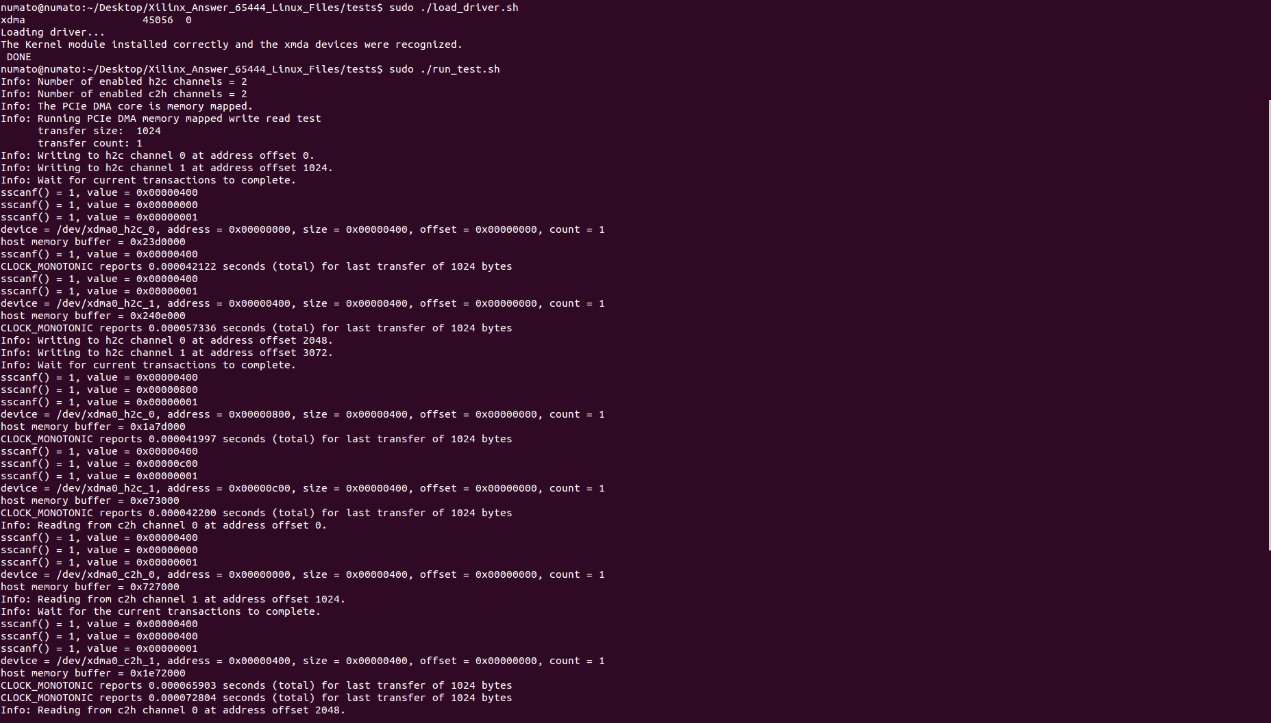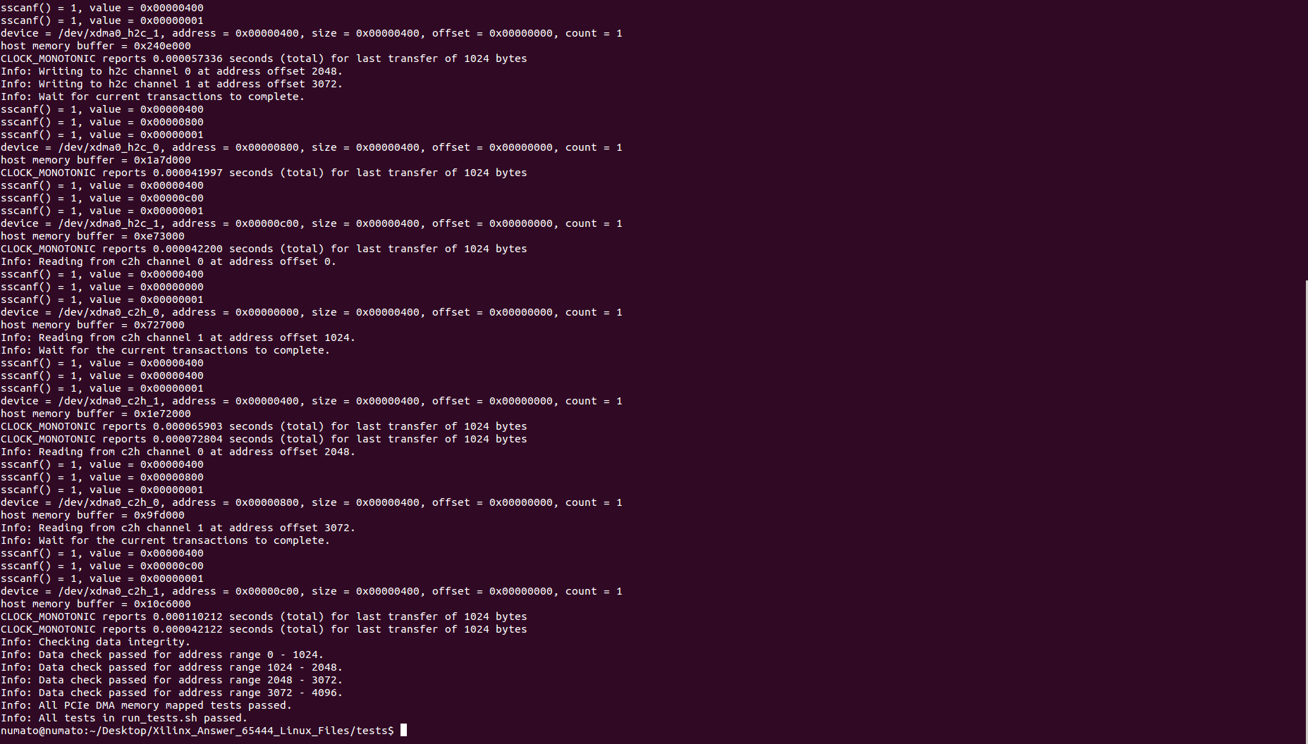 Once the driver is being loaded, we can now test the DMA. This can be done by running the script “run_test.sh”. If the tests in “run_tests.sh” pass without any errors, you will see a message that says “All tests in run_tests.sh passed.”. Use the following command to run the script: