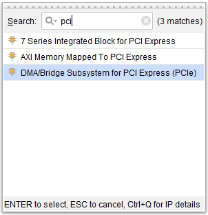 In the Diagram window, right-click and select “Add IP” from the popup menu. Search for “DMA/Bridge Subsystem for PCI Express (PCIe)” and add it to the design by selecting it.