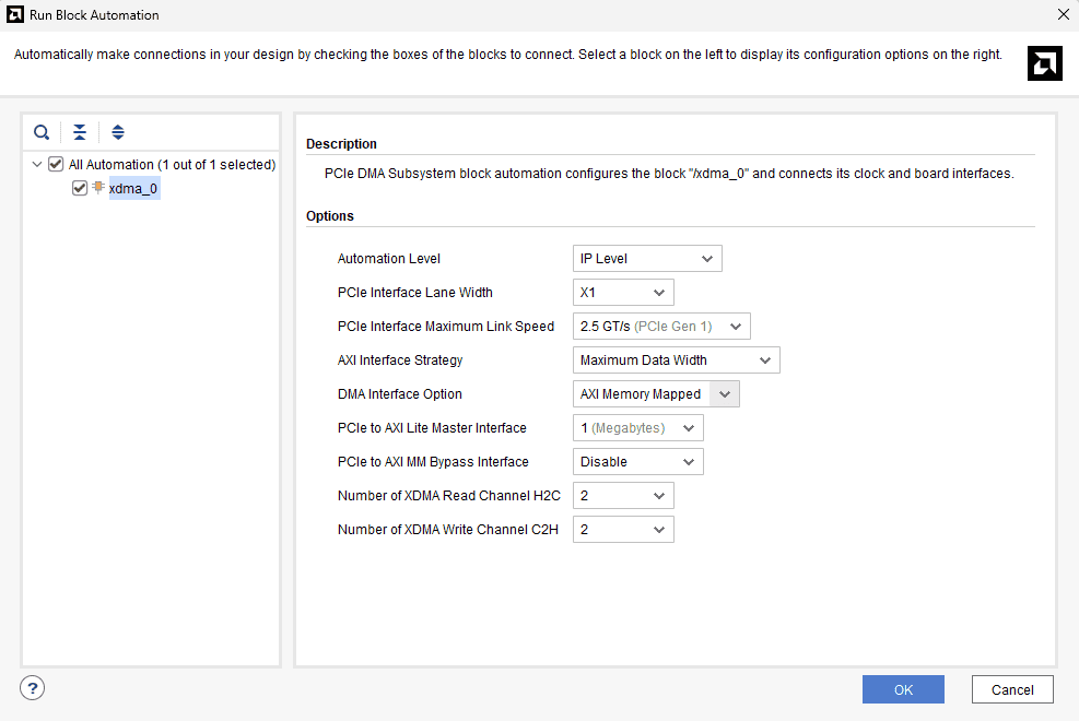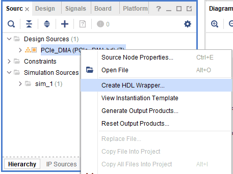 Right-click “PCIe_DMA” in the “Sources” window, select “Create HDL Wrapper” from the popup menu. Click “OK” on the window that appears to finish generating a wrapper.