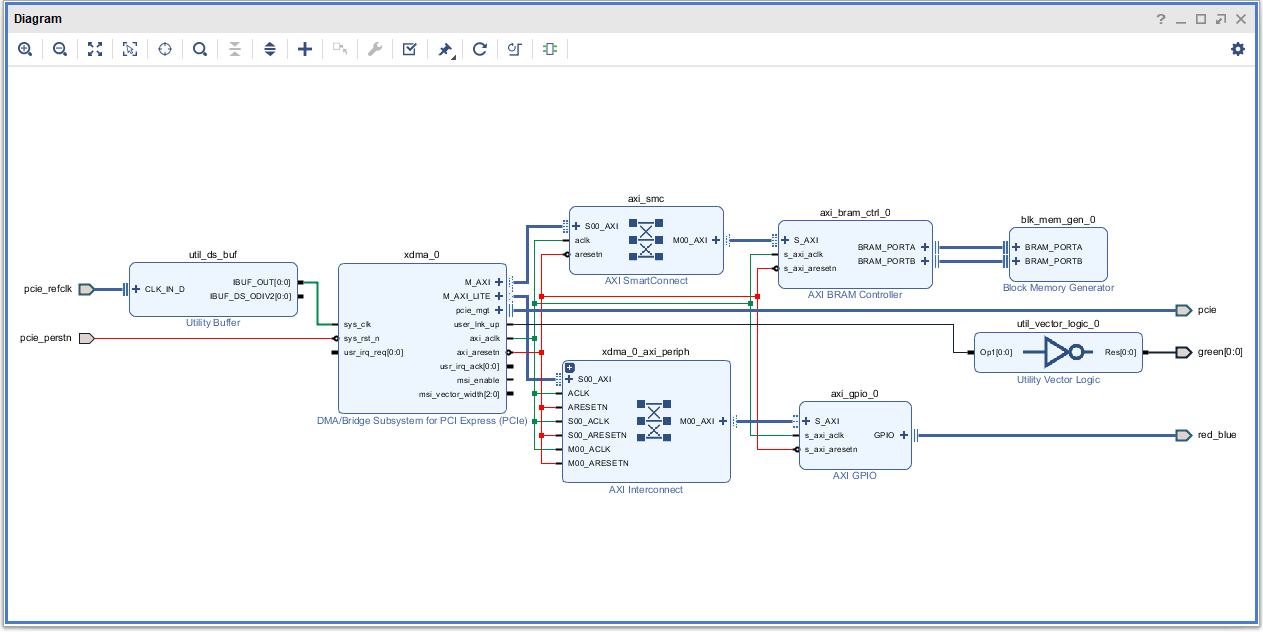 Select the “Validate Design” option from the Tools menu to make sure that the connections are correct. The final Block Design should look similar to the following design (change the port names accordingly).