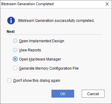 Click “Generate Bitstream” to synthesize, implement and generate a bitstream. This process will take some time to complete (around 20-30 minutes). Once the bitstream generation is completed, select “Open Hardware Manager” and click “OK“.