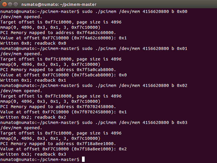 sudo ./pcimem /dev/mem 4156620800 b 0x00