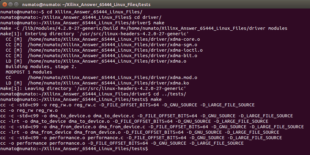 Download the Xilinx Answer 65444 for Linux System from here and save it in a specific location. In the command-line terminal, change the directory to the “Xilinx_Answer_65444_Linux_Files” folder. Enter the /Xilinx_Answer_65444_Linux_Files/driver/ folder by executing the command cd driver/ and compile the C program by executing the command make. Once the compilation is completed, change the directory to the /Xilinx_Answer_65444_Linux_Files/tests/ folder by executing the command cd ../tests/ and execute the make command to compile the C program in the folder.